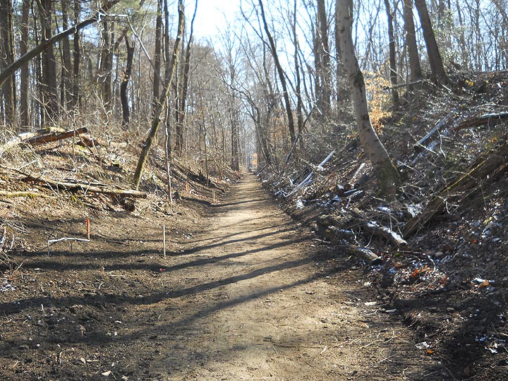 Those who have been out Creek Road lately have seen the big construction equipment and the large (interstate-like) gouge out of the woods at the S-curve next to one of the railroad abutments. All this signals that after having been planned well over a decade ago, the multi-use Pomeroy Trail is now under serious construction. It will connect Creek Road for cyclists, runners, and other pedestrians all the way to Newark’s Hall Trail, which runs parallel to the Amtrak lines at the south end of central Newark. Here’s how things looked today from the northern terminus of the Pomeroy Trail to the park at the corner of Paper Mill Road and Cleveland Avenue.