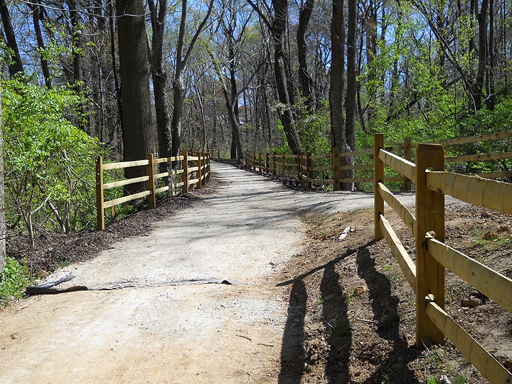Progress has been made since February on the Pomeroy Trail’s northern section. Split-rail fencing, pre-final surfacing, and lighting infrastructure has been added along much of this portion of the trail. The following views were from April 7.