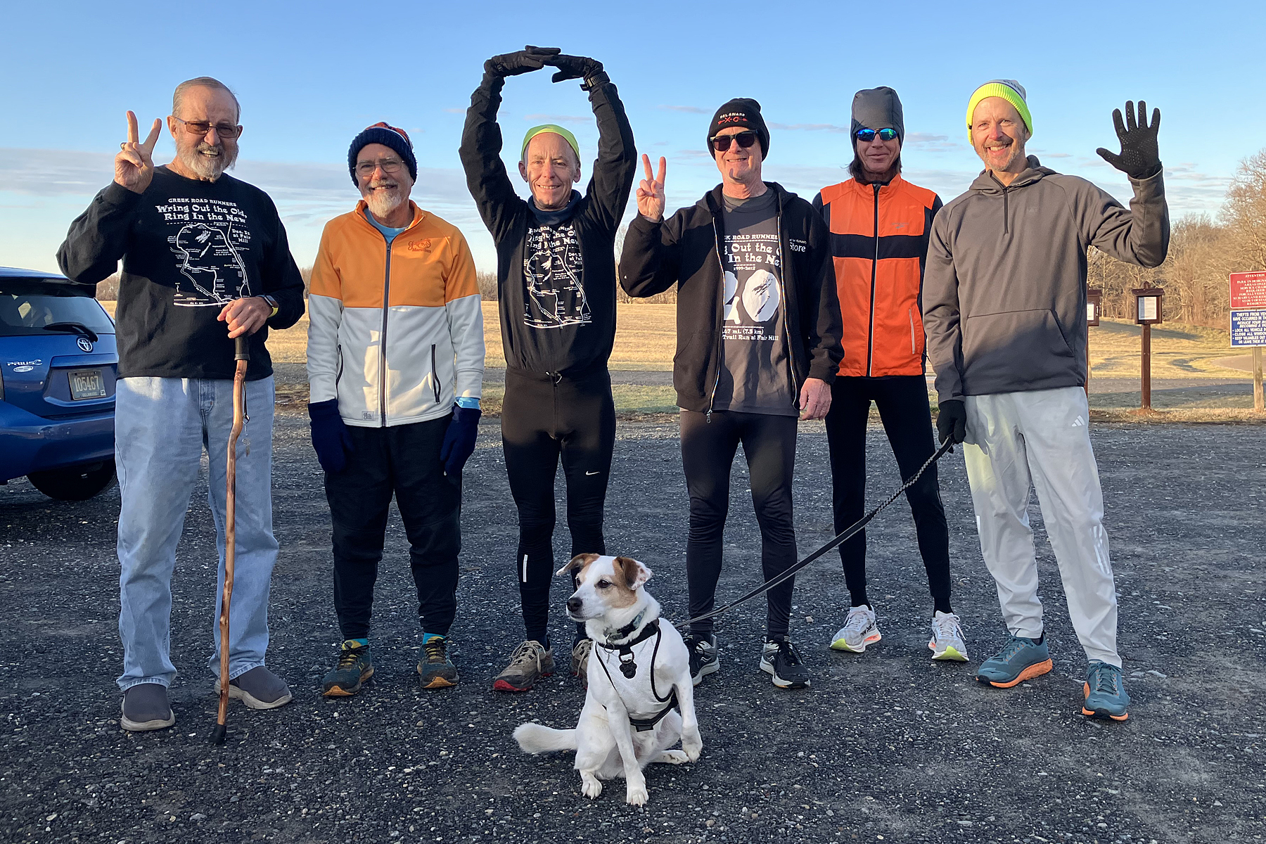 CRR veteran Bruce Hubbard (left, a “two”) came out to help Bob Opila, run organizer Bill Rose (the “zero”), Mark Deshon (the other “two”), Greg Cauller, Dave Schultz (the “five”), and Bandit salute the new year.