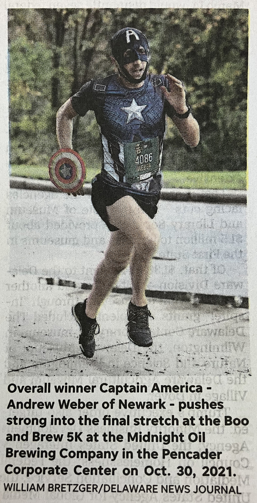 Well, no. But this archival photo showed up in the April 11th edition of the Delaware News Journal. It shows CRR Andrew Weber as Captain America in the Halloween-themed Boo and Brew 5K back in 2021. Masked and all, this superhero won the race in an impressive 17:51.