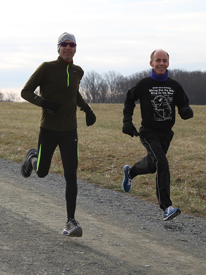 The proverbial “pot of gold” was there at the finish—the box of Munchkins™—thanks to Charlie Riordan (“Charlie runs on Dunkin’”), along with several bottles of sparkling juice to help celebrate the end of 2013. Even a park ranger got in on the fun; having done her duty by checking to make sure we weren’t bringing alcohol into the park, she enjoyed some of the treats provided. Thanks, Bruce Hubbard, for bringing the additional sugary fried edibles. Thanks to Vince McIntosh and Vic Kaliakin for bringing extra bubbly.