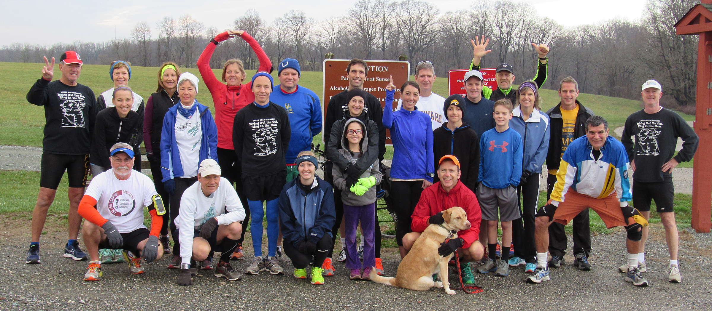 Twenty-five runners salute 2016 – front row: Mark Hufe, Bob Opila, Allison Rose, Molly Shay, and Dave Schultz with Dakota; second row: Emily Barton, April Anderson, Bill Rose, Amy Shay, Christine Schultz (the “one”), Ben Schultz, Owen Edwards, and Paul Amer; back row: Bruce Hubbard (the “two”), Deanna Pillarelli, Beverly Jackey, Sue Barton (the “zero”), Matt Robinson, Mike Shay, Charlie Riordan, Dave Edwards, Steve Tague (the “six”), Judy Knox, Bob DiIorio, and Mark Deshon.