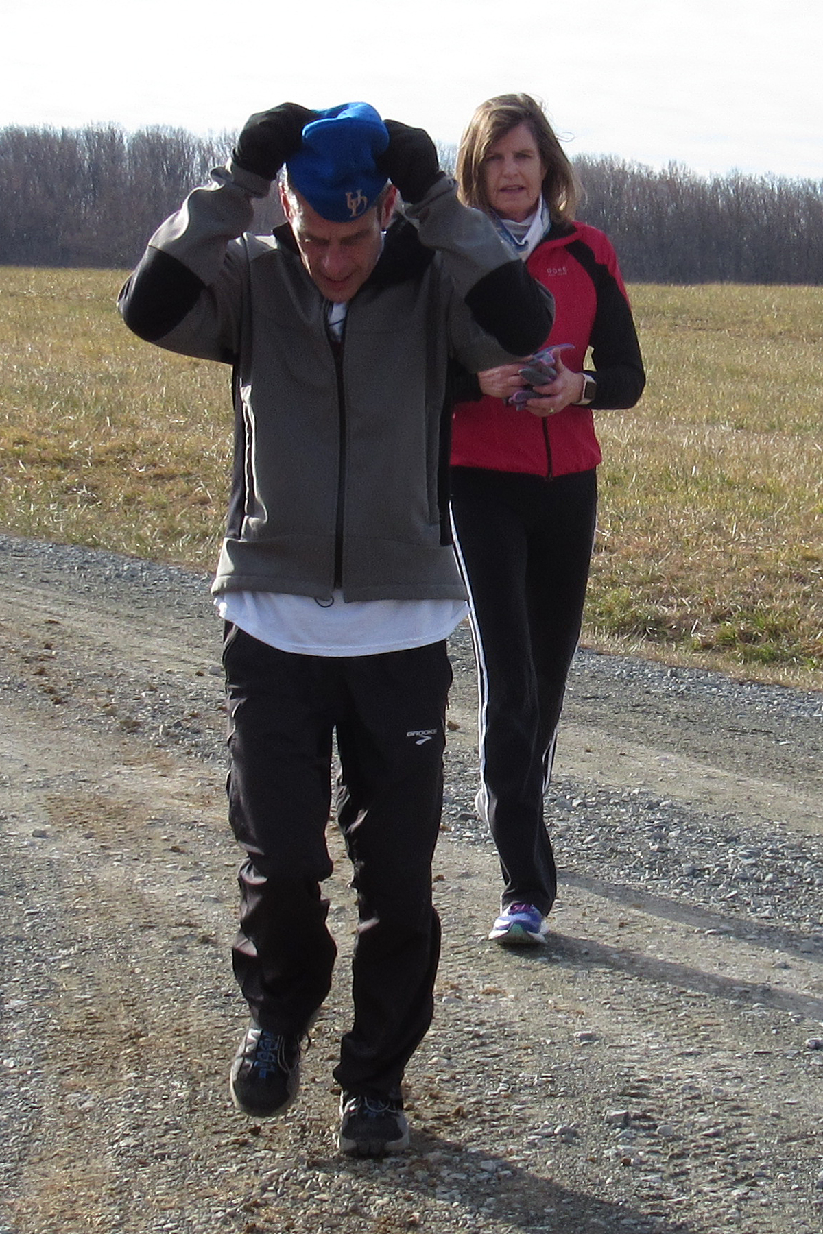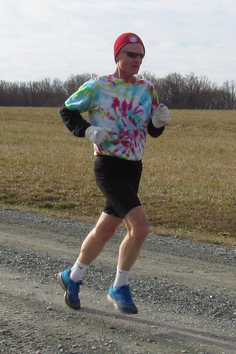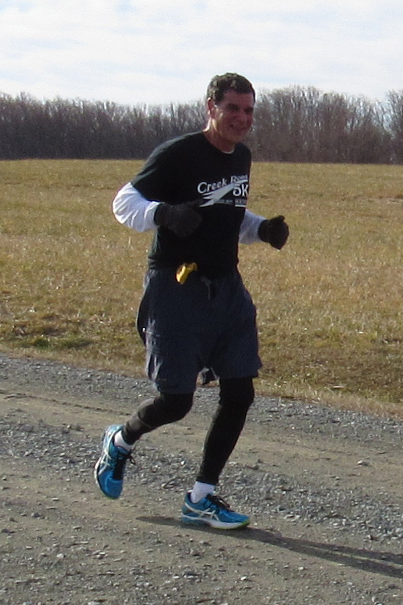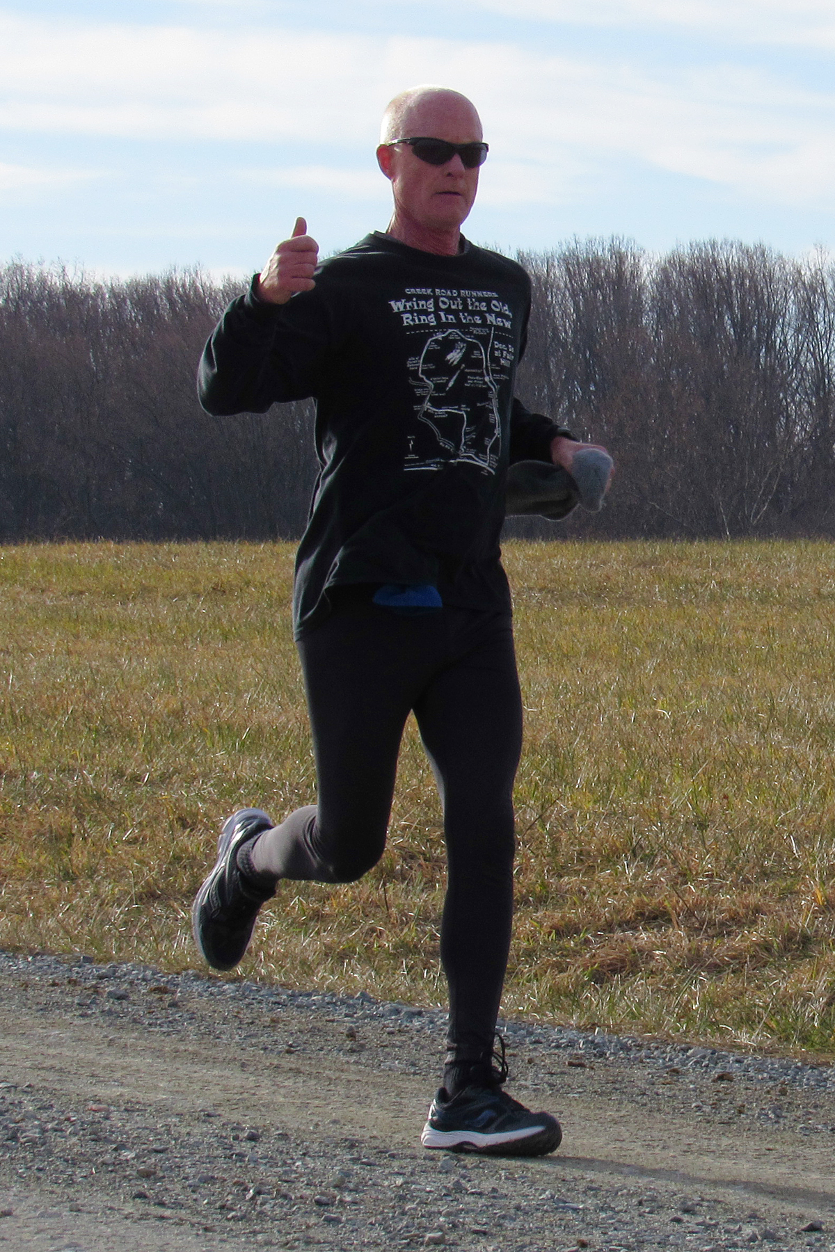 Runners headed northward and quickly spread out along the initial upgrade. Along the plateau near the Pa. state line, a group of mountain bikers passed in the opposite direction and shouted encouragement. CRR Dave Schultz, with Dakota in tow, held a pretty good pace early but was destined to take the first shortcut, give the dog a break, and accompany family members Lawson and wife, Christine, to the finish (son, Ben, having opted for the warmth of their vehicle).