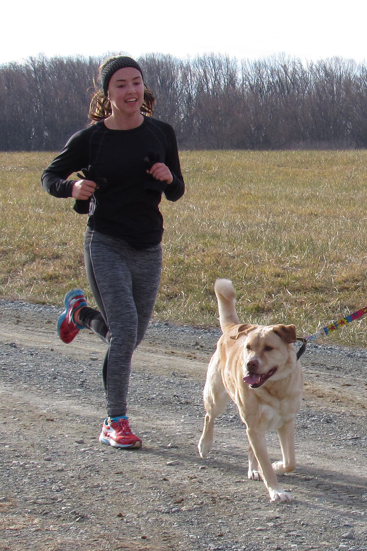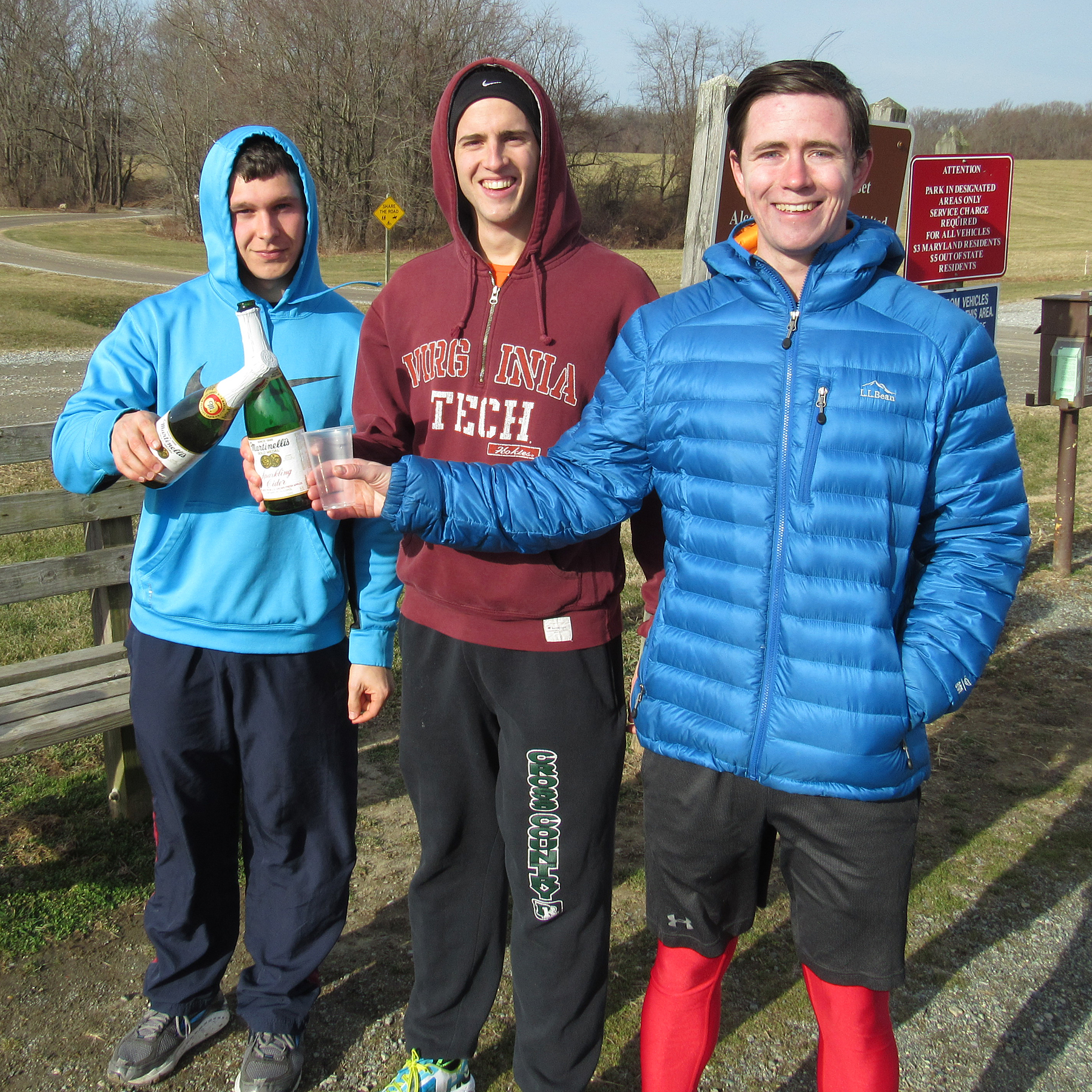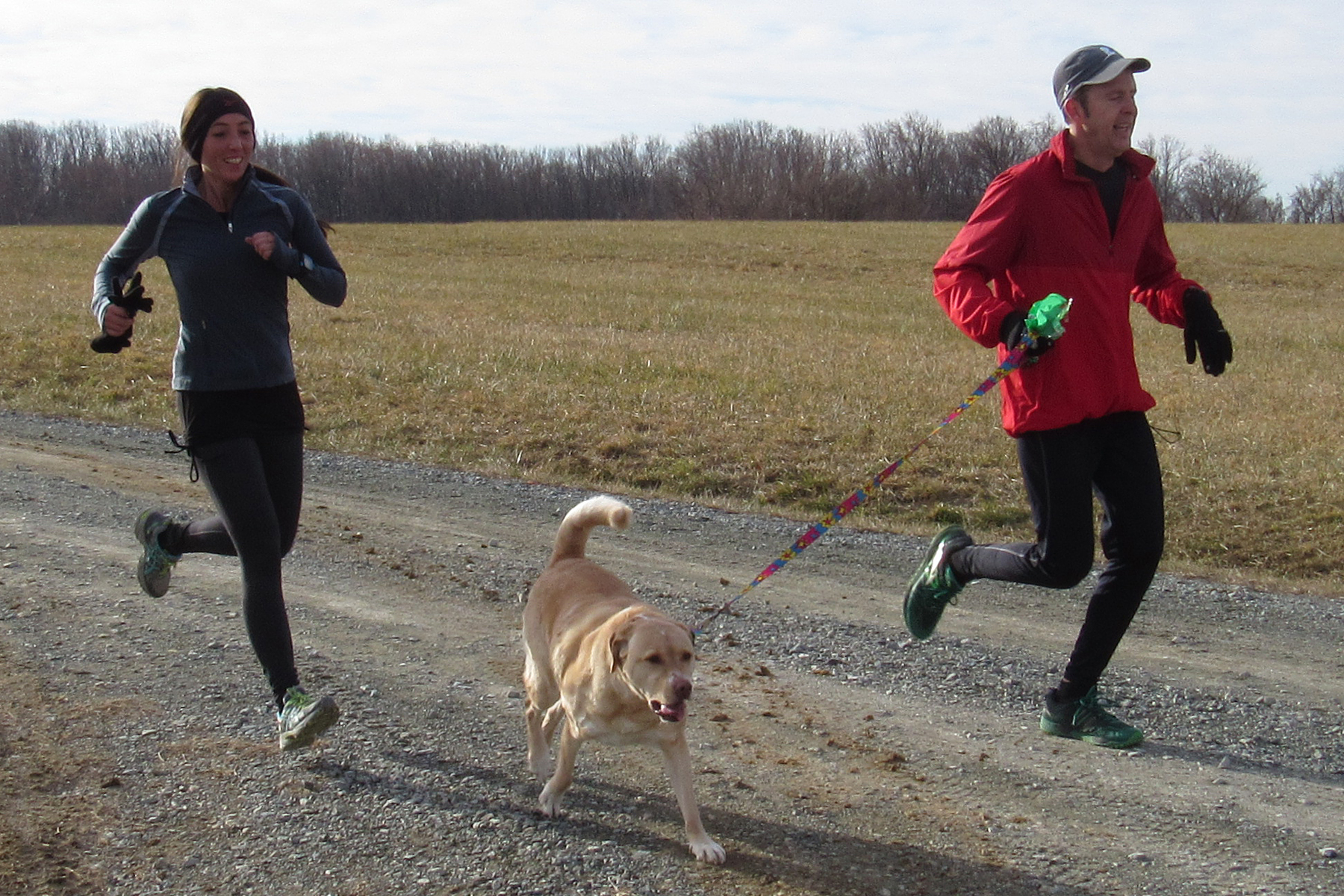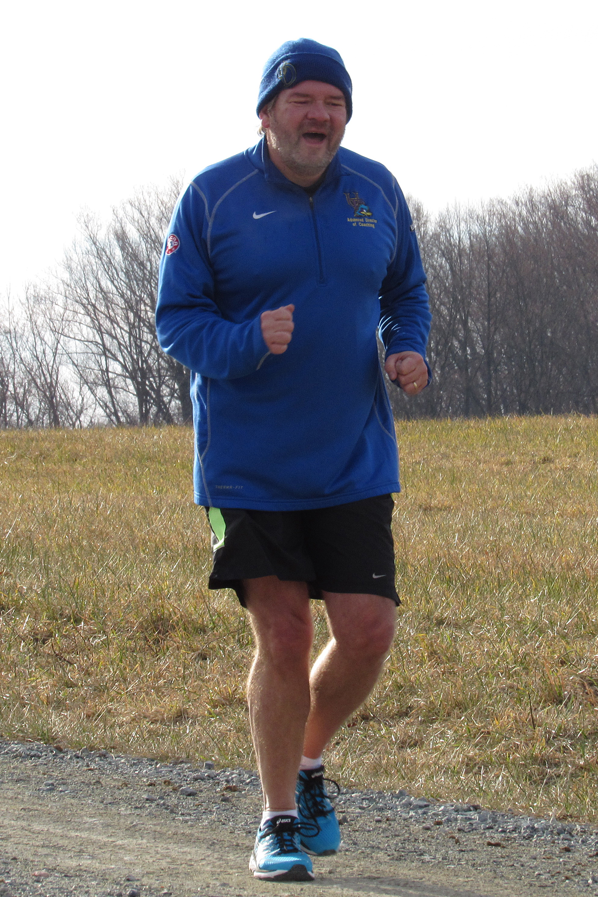 Runners headed northward and quickly spread out along the initial upgrade. Along the plateau near the Pa. state line, a group of mountain bikers passed in the opposite direction and shouted encouragement. CRR Dave Schultz, with Dakota in tow, held a pretty good pace early but was destined to take the first shortcut, give the dog a break, and accompany family members Lawson and wife, Christine, to the finish (son, Ben, having opted for the warmth of their vehicle).