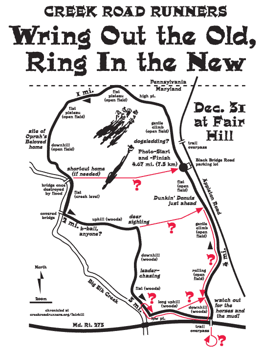 Jordan Deshon, a veteran of at least a few “Wring Out the Old” events, led his friend Schoch up the hill after the two-mile mark and failed to make the critical righthand turn toward the bottom of the big hill. But they did see a couple deer for their mistake, “right where it says ‘deer crossing’ on the shirt,” he said.