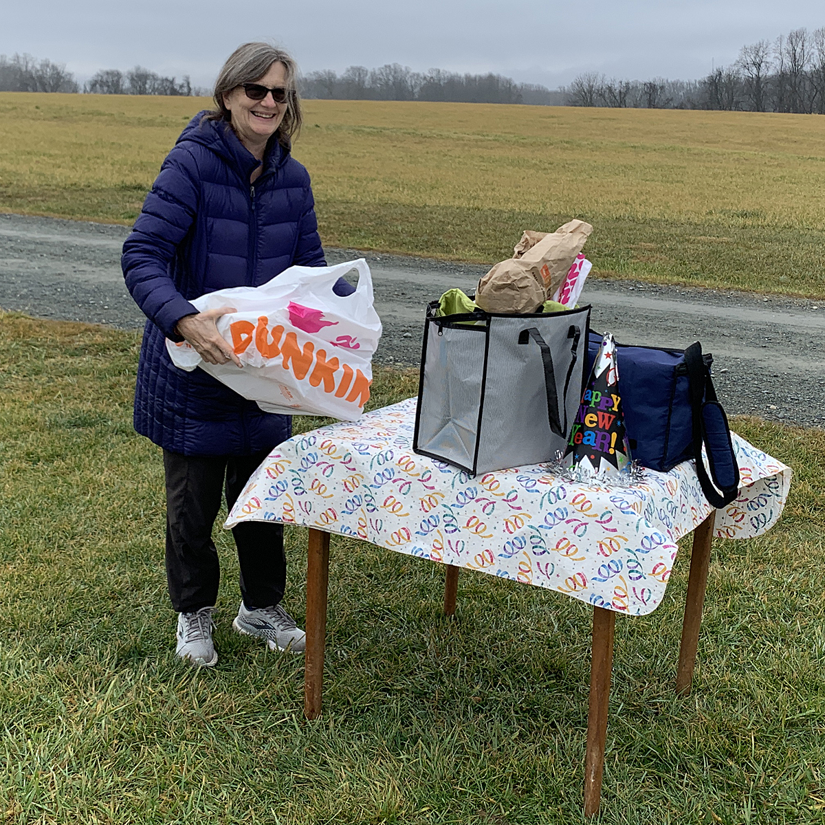 While the runners and walkers were out on the course, Karen Rose busily prepared the refreshments table so donuts, coffee, and hot chocolate would be ready for the tired finishers.