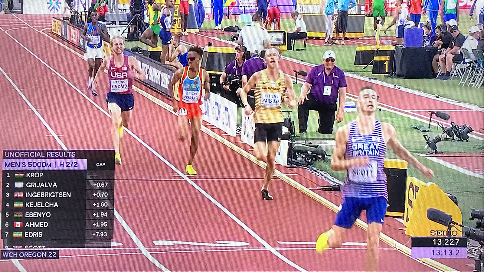 Fast forward to the 5000m semifinal #2. Parsons was competing for a spot in the final with the likes of the always-prominent Kenyan, Ethiopian, and Ugandan runners, as well as Norway phenom Jakob Ingebrigsten, who had just placed second in the 1,500m final. Another local runner in that same race was Charter School of Wilmington and Harvard standout Kieran Tuntivate.