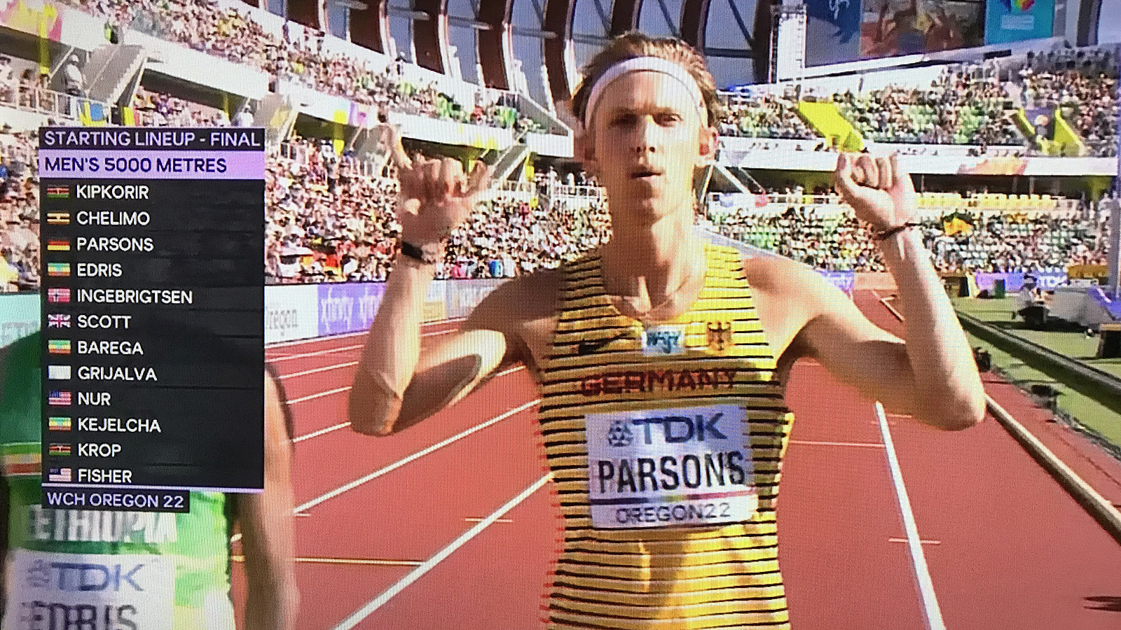 > Check out the video of the race with Parsons sightings as indicated below (times approximate). 5:00 – Sam looking around mid-race, taking it all in, enjoying himself 9:58 – more Sam 12:40 – Sam moving up on the outside 12:55-13:01 – Sam and Jakob Ingebrigsten running together 15:20 – Sam hitting the bell lap in 6th place 16:17 – Sam finishing 18:09 – Christina cheering