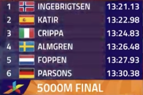 Finishing 6th out of the 25 competitors from all over Europe, Parsons, who clocked in at 13:30:38, bested his last month’s World Championship finishing time by 15 seconds. Unfortunately, as in the 5000m at the Worlds in Eugene, Ore., he couldn’t hang late with Jakob Ingebrigsten of Norway, who took the European title as well.